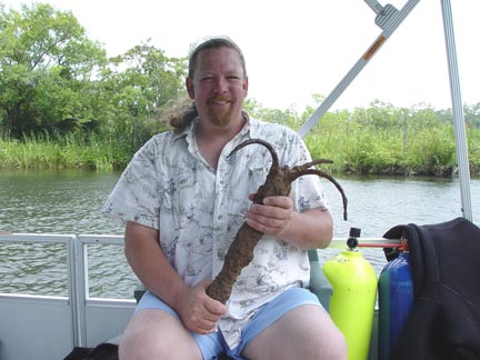 by: Jerry Fortenberry, Tena Hendrix, Here is another fun dive trip report for your viewing pleasure. This is from our second trip of this season to the Cooper River in S.C.. We started off Wednesday to head towards Charleston. We arrived, checked in at our hotel and planned for the next days dives. I did not mention it from the last report, but while diving our last trip, I had found an old grappling hook on the bottom of the river. I assumed it was just a rusty piece of junk and left it. Later when I described it to Jerry, he informed me that it may have been a relic from the 1700's ships! and that it was a shame I had left it on the bottom. Once we arrived at out first destination on this trip, I thought I would try to locate the piece again. It was a million to one shot considering the size of the river, the black water, and the fact I did not know where I had encountered it the first time. As we approached the location, we observed an 8 foot gator floating in the middle of the river. I decided that he was marking the location of the hook I was after, so I jumped in where he was lounging, he of course, went under when the boat approached, and I went straight to the bottom. After about 20 minutes on the bottom at around 40 feet, I was searching some gravel beds for bones when I observed a clump of sea grass wrapped around something, can you guess what it was?