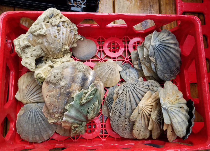 The usual suspects, lots of fossil scallop shells and shell clusters.