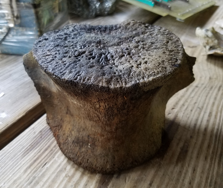 The dark brown spot in the middle of the vert is where the following piece was attached. I am still piecing this back together and will attach it later. It appears to be another vertebra? It is not like any I have found, it has many layers.