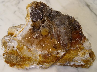 The above two specimens are what I call pseudomorph quartz after calcite, these crystals are hollow and very fragile, I have been told there is another term for these crystals as they are not a complete replacement of the original calcite crystal?, but a quartz shell taking the form of the once present calcite. The definition I found for a pseudomorph is: "The existense of a mineral with the crystal form of another species. Pseudomorphism may occur by substitution, encrustation, or alteration". It seems that these would fall into that catagory. If someone knows a more technical term please let me know.