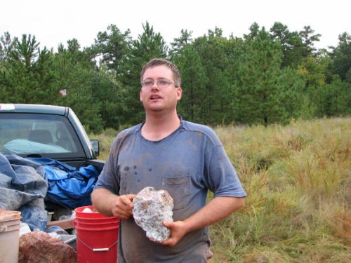 Tom Leary Tom's Lazulite Donnie Dunagan and his Son Hunter. Hunter spotted this monster rutile in the wall which led to a two day extraction by Donnie and Ed Doyle. The digging was motivated by cheerleading from Steve Barr and Romin Dawson. This photo was taken just after extracting the monster, record breaking rutile specimen. Tripp holding the monster 36 pound rutile. Graves Mountain from the top. Savannah River Pat collecting firewood.